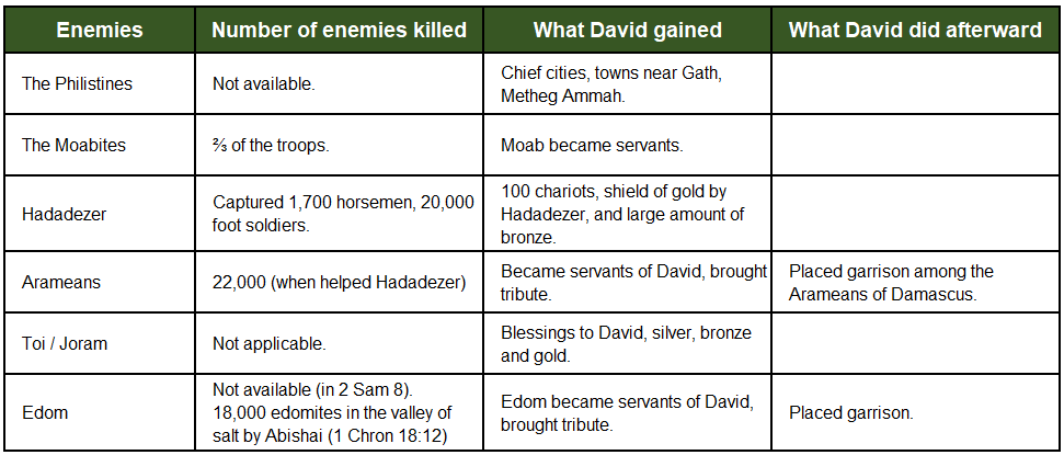 Although we do not know the exact details and timing of these wars (against Philistine, Moab, Aram, Edom), that David was able to defeat his enemies in all four-fronts is noteworthy.